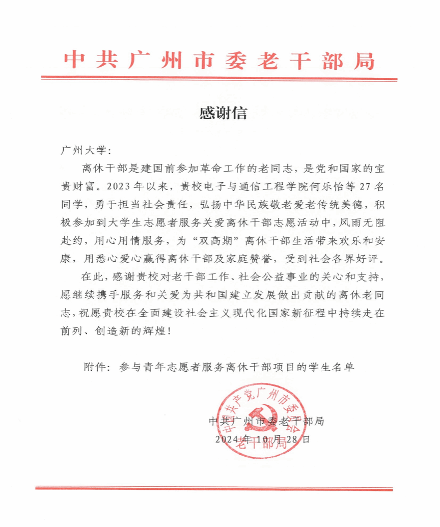 为弘扬尊老敬老爱老的传统美德,在全社会营造尊老爱老的良好氛围,我校电子与通信工程学院学生第一党支部学生党员积极参加由广州市委老干部局主办,广州市志愿者行动指导中心、共青团番禺区委员会、广州青年志愿者协会、广州大学城志愿者协会承办的“青倾卿”(让我来陪伴您)青年志愿者服务离休干部志愿者活动,以陪伴关爱为服务核心,为离休老干部带去生活以及身心上的关爱慰问及帮助。鉴于27名学生志愿者的辛勤劳动和高质量服务,近日,中共广州市委老干部局特向广州大学发来感谢信。
