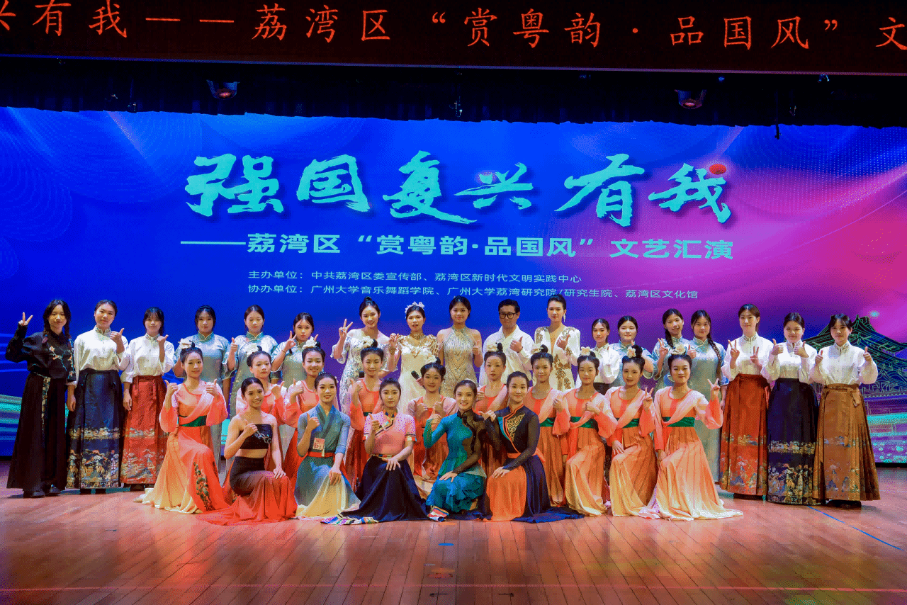 为丰富市民群众的精神文化生活,推动荔湾文化的高质量发展,11月15日晚,由中共荔湾区委宣传部、荔湾区新时代文明实践中心主办,广州大学音乐舞蹈学院、广州大学荔湾研究院/研究生院、荔湾区文化馆协办的“强国复兴有我——荔湾区‘赏粤韵·品国风’文艺汇演”于荔湾文化艺术中心精彩上演。