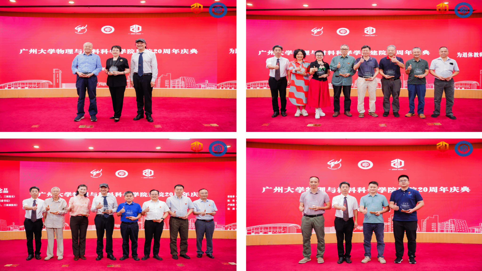 大会向学院前身单位系领导代表、学院退休教师代表、原任院领导、突出贡献的校友代表等颁发广州大学物理与材料科学学院建院20周年庆典荣誉纪念品。