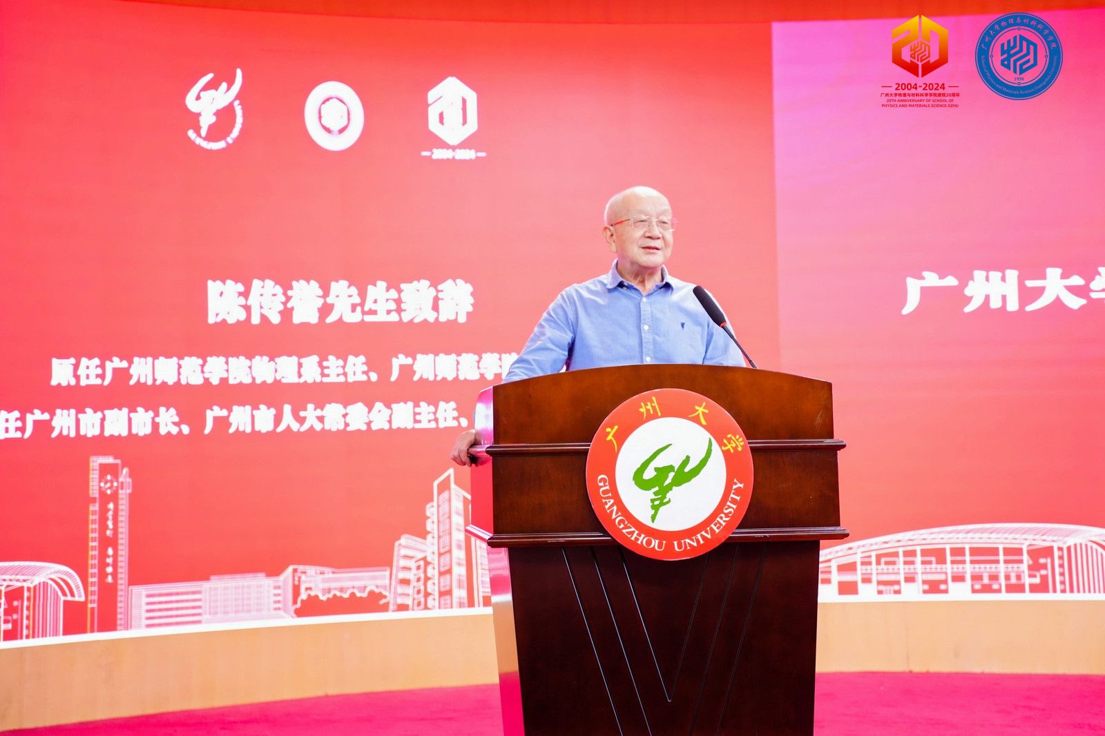 原广州市副市长陈传誉教授代表学院前身广州师范学院物理系等单位的老前辈讲话并赠送金笔题词,他表示,希望物理与材料科学学院以此次二十周年庆典作为一个小结、一个加油站,不忘初心,继续前行。