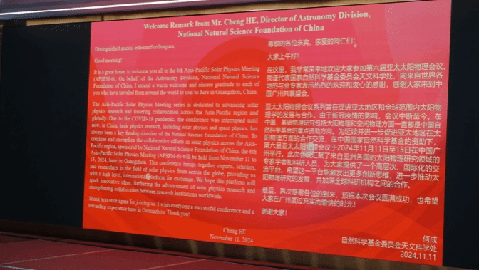11月11至15日,第六届亚太太阳物理会议于广州顺利举行。本次会议由中国科学院国家空间科学中心主办,广州大学物理与材料科学学院承办。中国科学院方成院士、汪景琇院士、广州大学副校长孙延明教授,以及来自15个国家的160多位专家学者参加了本次会议。