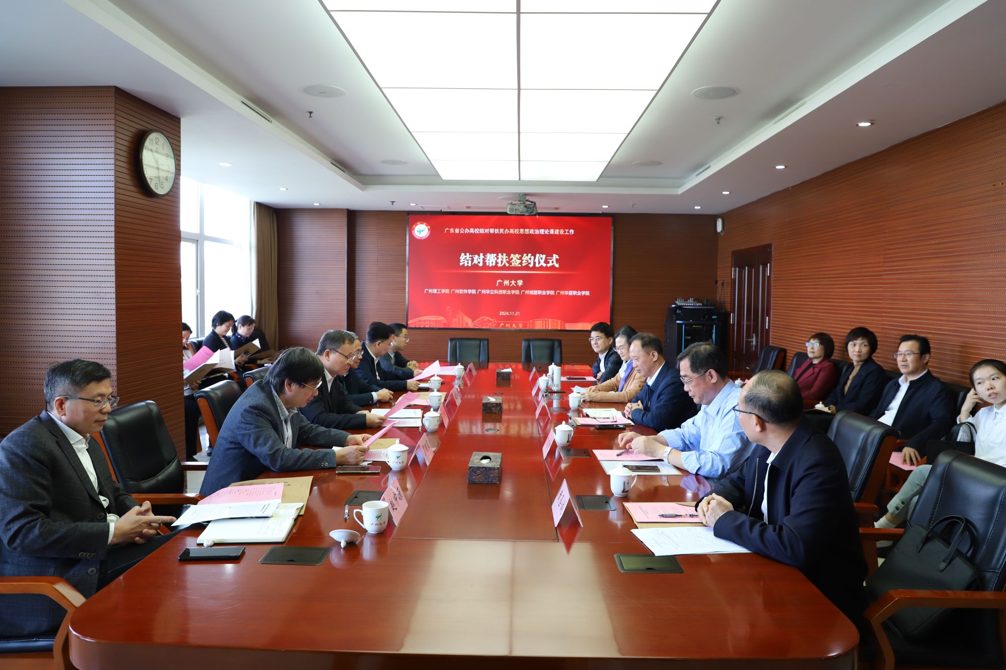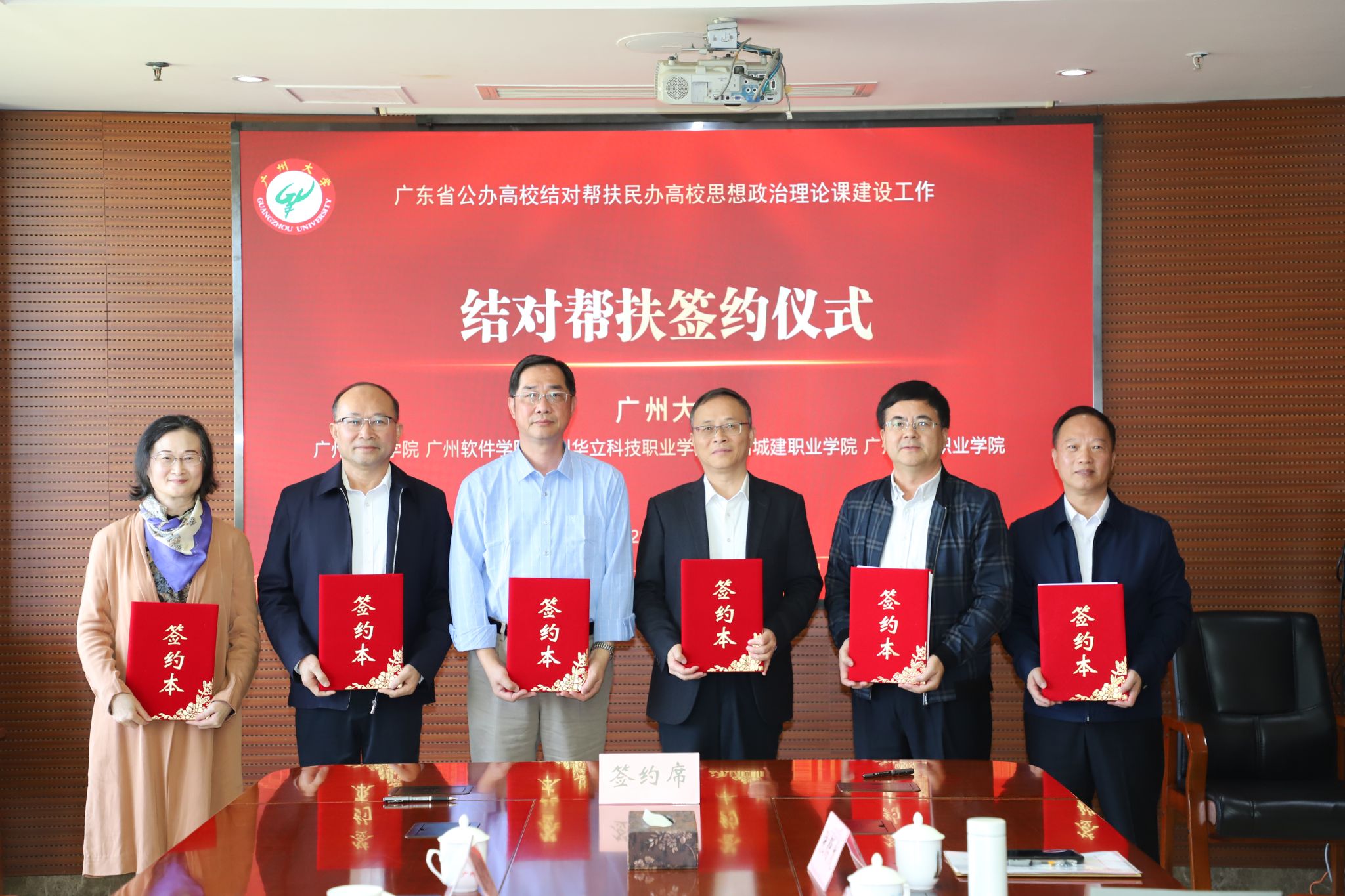 为深入贯彻落实习近平总书记关于学校思政课建设的重要指示精神,全面落实新时代学校思政课建设推进会精神,推动全省高校思政课建设优质均衡发展,按照省委教育工委、省教育厅《广东省公办高校结对帮扶民办高校思想政治理论课建设工作方案》要求,11月21日,我校与广州理工学院、广州软件学院、广州华立科技职业学院、广州城建职业学院、广州华夏职业学院五所民办高校举办结对帮扶高校思政课建设签约仪式,重点支持民办高校思想政治理论课建设全面提质创优。我校党委常委、副校长吴开俊,五所民办高校党委书记出席签约仪式,相关职能部门、学院负责人参加活动。活动由我校马克思主义学院党委书记罗明星教授主持。