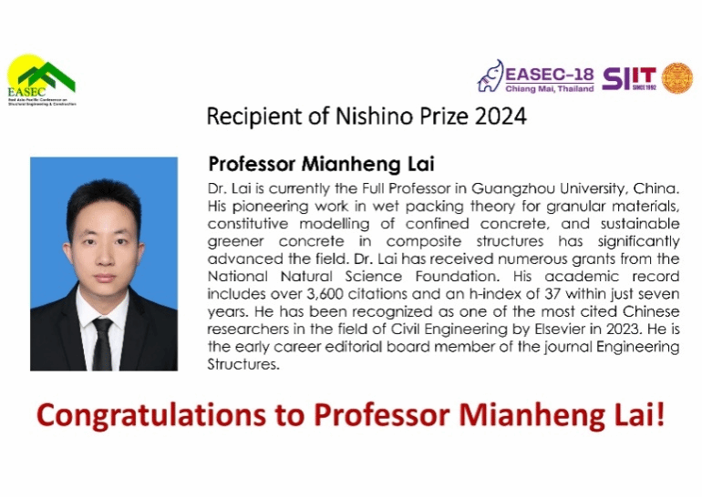 自2008年起,为表彰亚太地区资深工程师和45岁以下的青年工程师在结构工程与建筑领域做出国际公认的重大贡献,EASEC国际委员会分别为之设立了Nishino Medal与Nishino Prize,并在以后的历届会议上由专家提名有效候选人后经委员会选举产生1名Nishino Medal获得者(我校郝洪院士曾于2022年荣获EASEC-17的Nishino奖章)以及若干名Nishino Prize获得者。本届会议开幕式期间,会议主办方向我校赖勉亨教授颁发了Nishino Prize。