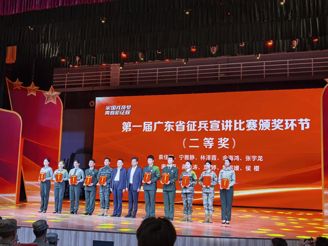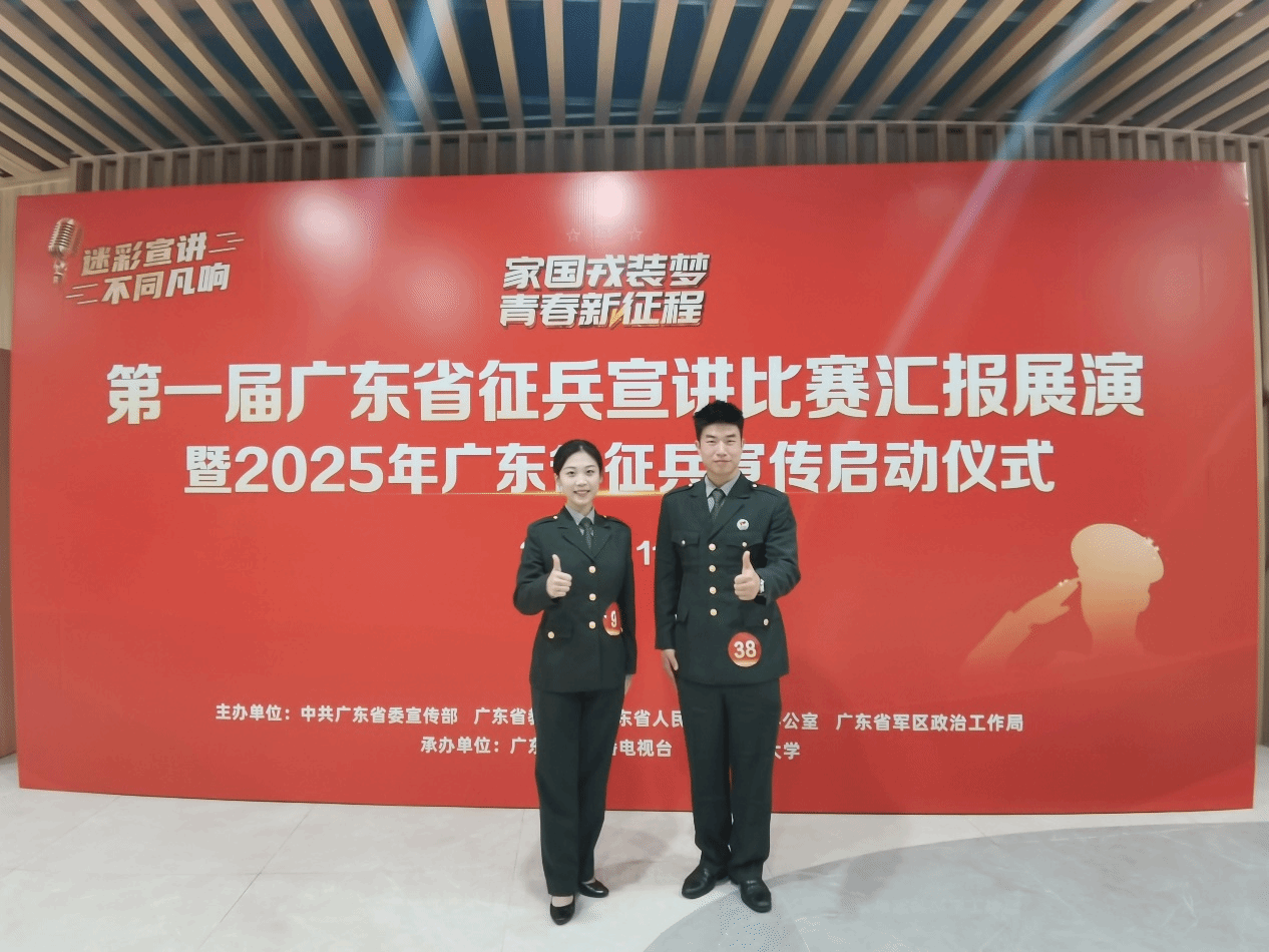 11月17日,“家国戎装梦 青春新征程”第一届广东省征兵宣讲比赛决赛在广东工业大学举行。来自全省各高校的优秀选手们齐聚一堂,以饱满的热情和生动的演讲,展现了当代大学生对国防事业的热爱与担当。我校人文学院张梓茵同学和新闻与传播学院唐新雨同学在决赛中表现出色,分别荣获一等奖与二等奖。