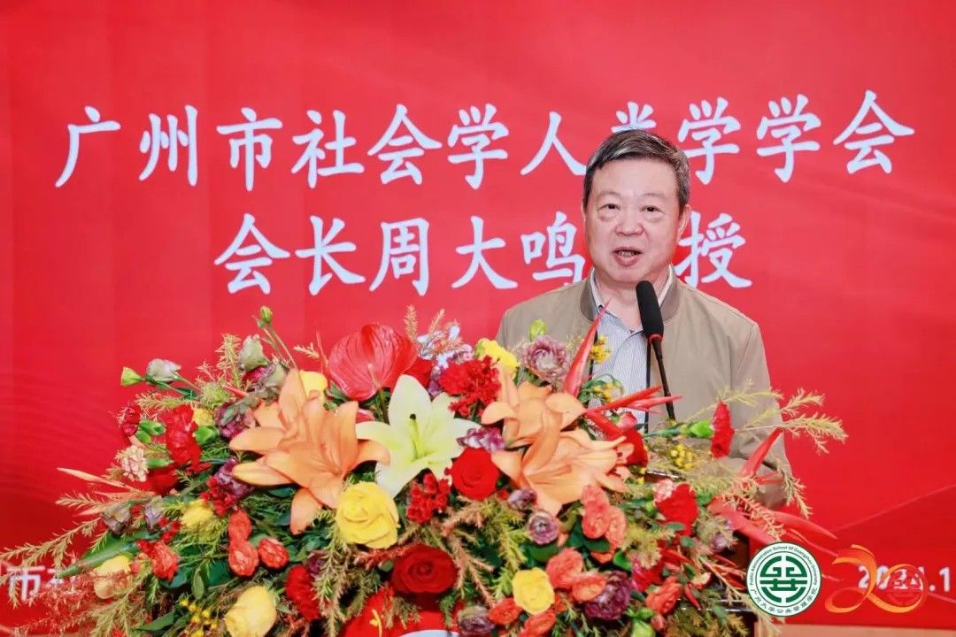 广州市社会学人类学会会长周大鸣教授在致辞中阐述了年会主题聚焦数字时代前沿问题的重大意义。他指出人工智能在提升生活品质、减轻工作负担以及助力科学研究方面发挥着积极作用。同时,专业学科并列发展、共同成长也具有重要意义。他对广州大学组织本次会议表示感谢,并呼吁社会学人关注大湾区问题,共同深度挖掘前沿性研究课题。