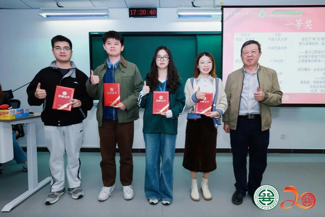闭幕式由广州大学公共管理学院社会学系党支部书记胡蓉副教授主持。广州市社会学与人类学学会会长周大鸣教授、广州大学公共管理学院社会学系谢俊贵教授、广州市社会科学院社会学研究所副所长陈杰研究员出席颁奖仪式。胡蓉副教授宣读了论坛优秀论文获奖名单。2024年年会共收到全国各地近200篇论文投稿,经过筛选有超过50篇论文入选本次年会并获得一二三等奖及优秀论文奖。