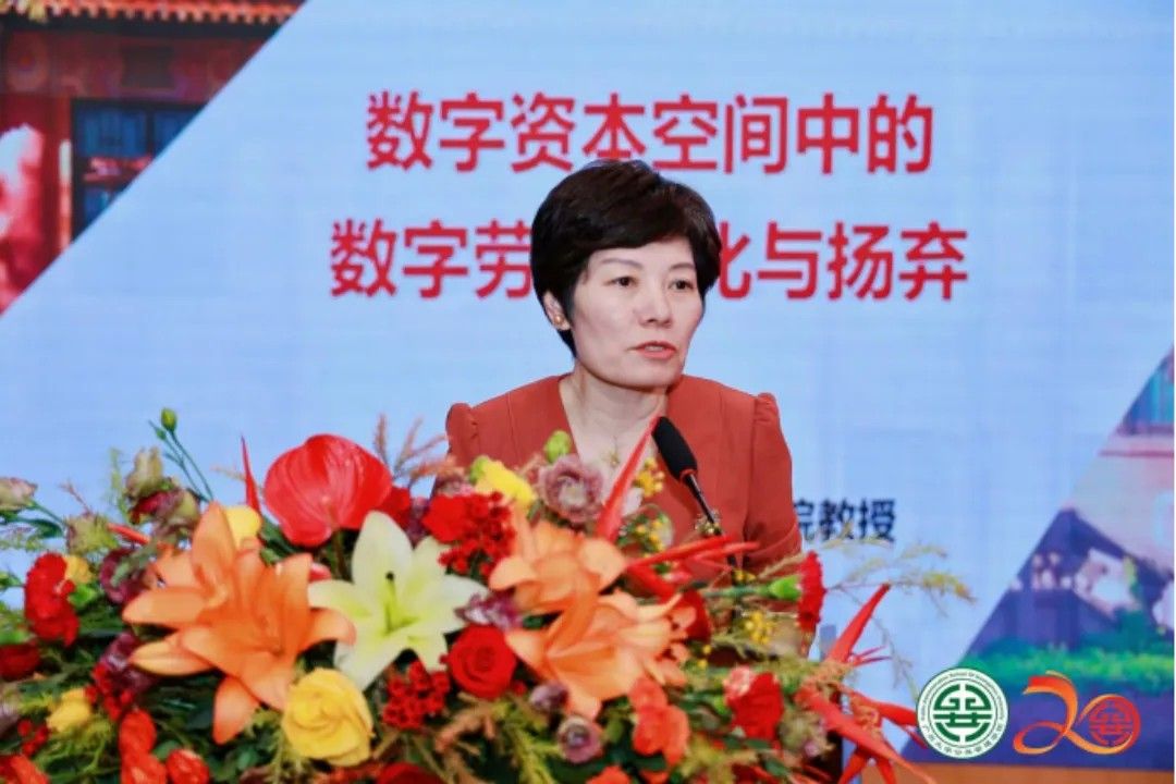 华南理工大学社会工作研究中心主任解丽霞教授在主旨演讲中探讨了数字资本空间中的数字劳动异化与扬弃。她指出数字劳动异化的出场逻辑与本质澄清,分析了资本逻辑下异化劳动四重数字化呈现,提出了数字化时代数字劳动异化的消解之路。她强调构建数字化新型生产关系应该消弭人与数字产品的对立,重塑技术与劳动者的关系,推动人的主体性的全面复归,实现人与人之间的共生共荣。